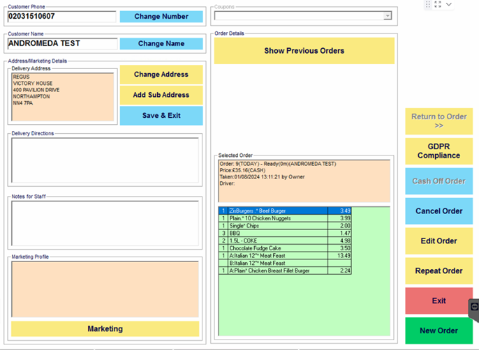 This window will show all customer data, previous orders and any saved notes. Once confirmed, that it is all correct, can press “New Order” and begin the order taking process.