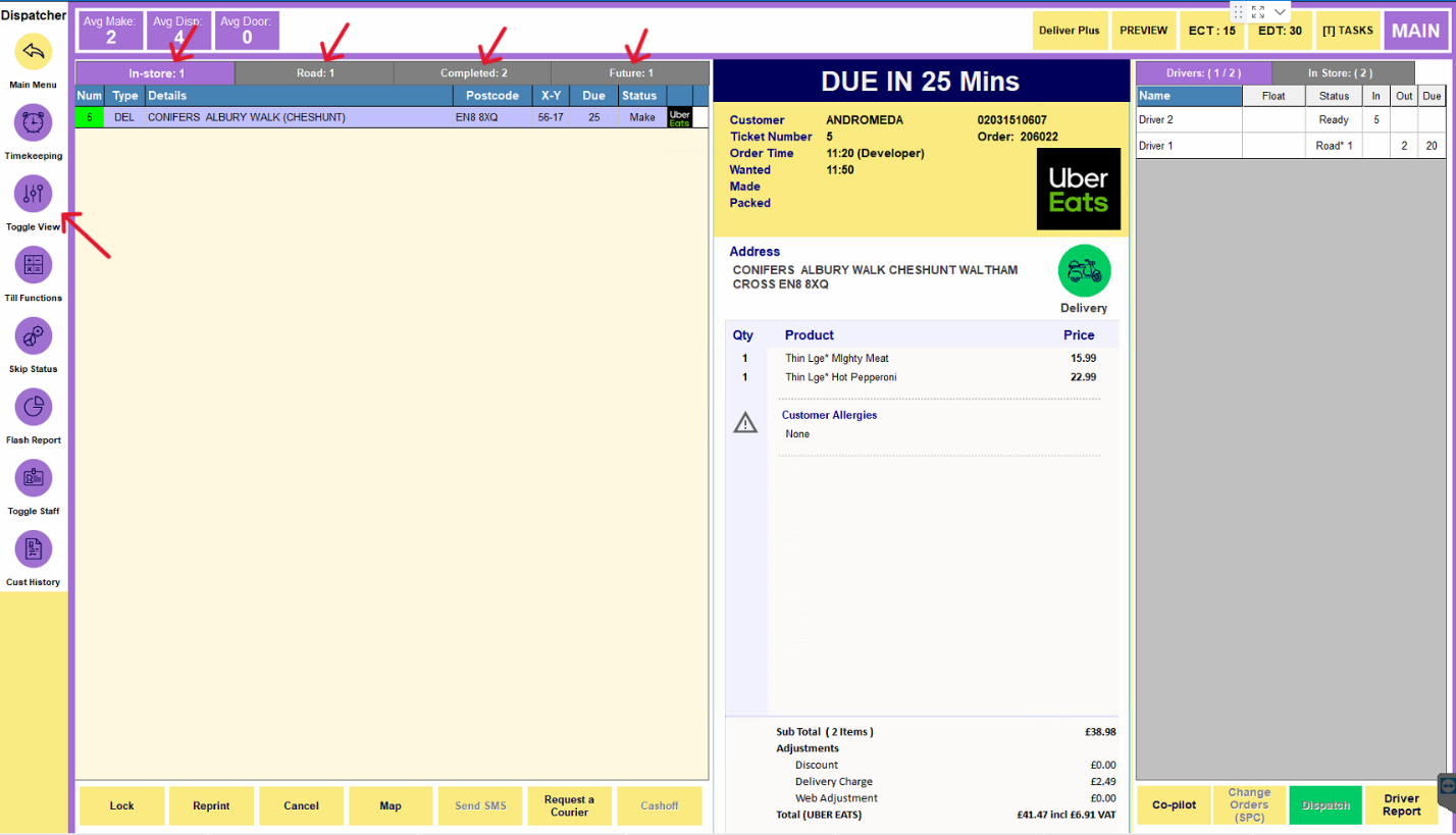 The first button within the dispatcher screen is the “Main Menu” button, which will return you to the main menu. Next one is the “Timekeeping” button and the third one is the “Toggle View” button. There are different ways to filter the orders in Andromeda POS and one of them is by their status. There are four statuses, which helps you have a better look of your orders and how the trading day is going on. “In-store” will show you all orders that are currently preparing in-store – they could be on make stage, on oven stage or on ready stage. Next one is “Road” status – it will show you all delivery orders, that are already dispatched to a driver and are currently on the road. Third status is “Completed”, which will show you the orders that are cashed off, completed, cancelled or refunded. The last one is “Future”, this status will show you all timed orders for today. On the screenshot below, you can see all 4 statuses on top of the orders: