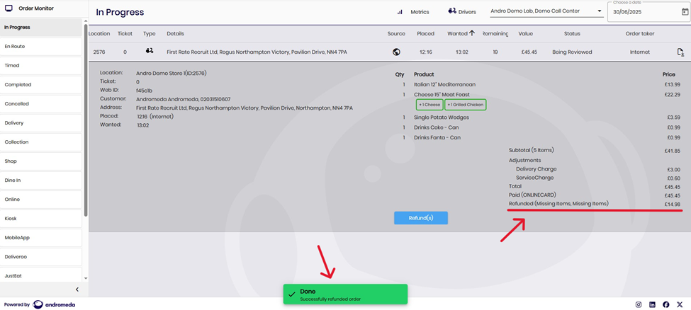 Online orders can now be refunded from Andromeda Portal or Mission Control. You can choose to either perform a full refund or a partial refund. Once you refund an order it can take between 1-3 business days depending on the customer’s bank. You need Stripe permission in order to be able to refund orders. Note: Only online card orders can be refunded from the Portal – including orders from Andromeda website, Andromeda mobile app, Kiosk and order at table. Aggregators orders or in-store orders can’t be refunded from the Portal!